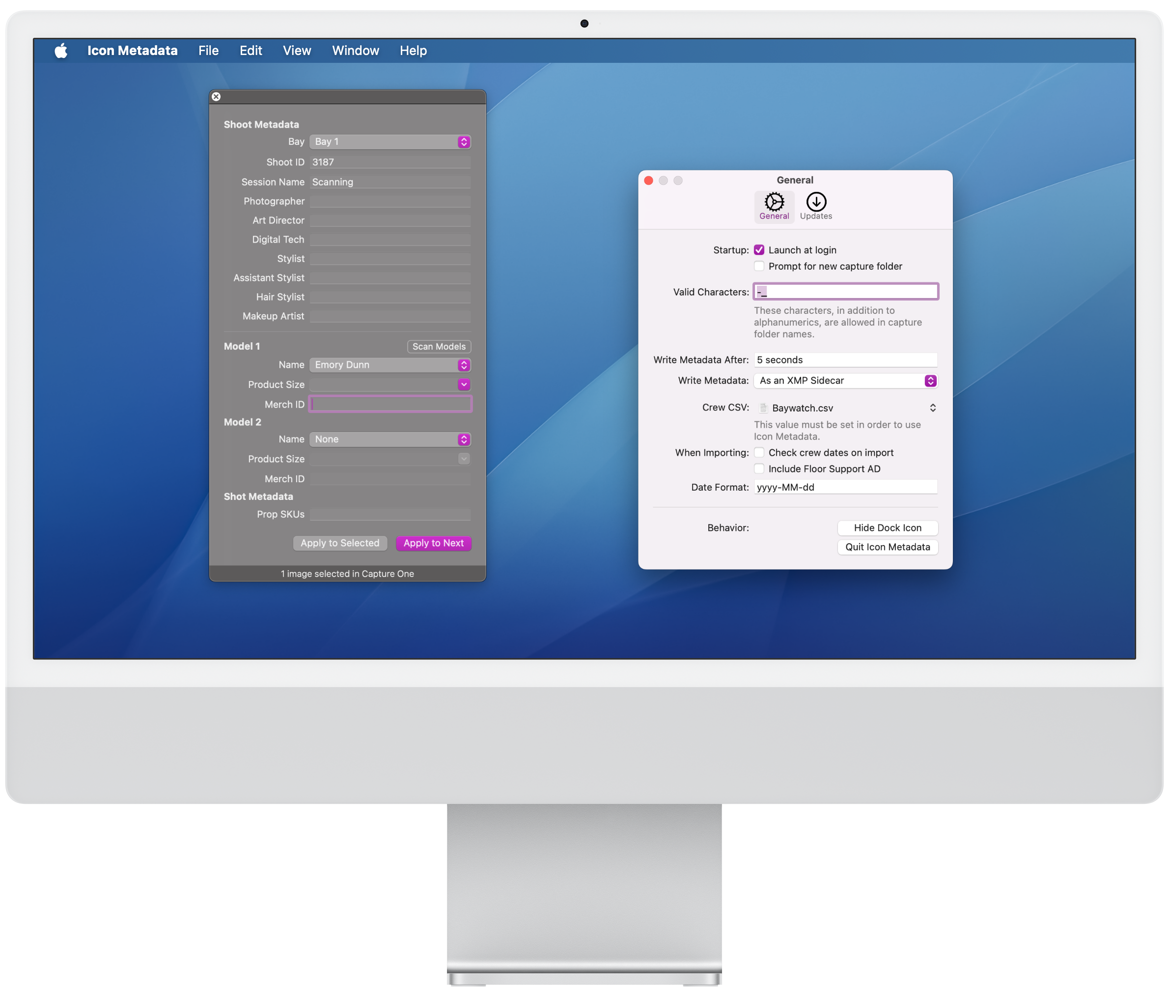 Icon Metadata integrates with Capture One to write metadata ensuring the correct metadata is ready for each shot. To help make the workflow seamless the application can be brought to the foreground with a global keyboard shortcut.